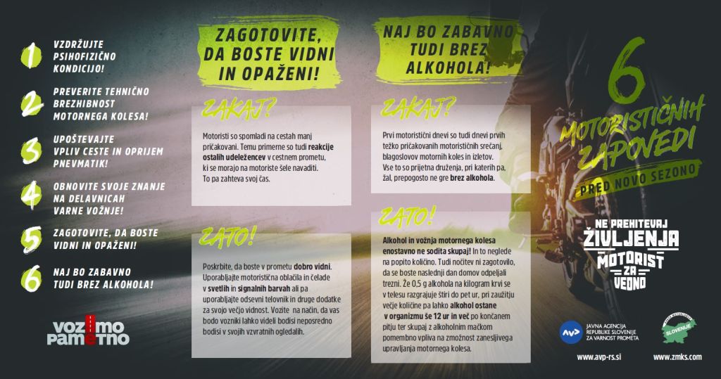 Policisti skupaj z agencijo pozivajo tudi k doslednemu spoštovanju odlokov zvezi z epidemijo. Če že morajo na nujno pot, naj motoristi in mopedisti v prometu ravnajo samozaščitno, naj ne precenjujejo svojih motorističnih izkušenj in ne podcenjujejo razmer na vozišču. Na začetku motoristične sezone je namreč asfaltna površina še vedno hladna in ne omogoča optimalne oprijemljivosti pnevmatik, zaradi zime pa je lahko na vozišču veliko udarnih jam in peska od zimskega posipa. Poleg tega se morajo motoristi zavedati, da njihove sposobnosti obvladovanja motornega kolesa najverjetneje še vedno niso na ravni tistih iz prejšnjega leta. V času akcije bodo izvajali nadzor in dosledno ukrepali zoper večkratne kršitelje cestnoprometnih predpisov – voznike enoslednih motornih vozil, opravljali meritve hitrosti in nadzor nad upoštevanjem prometnih pravil ter preverjali tehnično brezhibnosti vozil in psihofizično stanje voznikov.