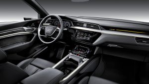 Trenutno je e-tron na voljo samo v močnejši izvedbi 55 quattro, kar pomeni, da ga poganjata dva elektromotorja s sistemsko močjo 265 kilovatov (360 KM), oziroma s 300 kilovati (408 KM), v posebnem voznem načinu. Kmalu bo na voljo tudi šibkejši 50 quattro z 230 kilovatov, ki bo imel tudi nekoliko krajšo avtonomijo, medtem, ko bo močnejša športna izvedba, ki pride prihodnje leto, z dodatkom tretjega elektromotorja iztisnila iz sebe skoraj 400 kilovatov. Močnejši e-tron z enim polnjenjem lahko prevozi do 417 kilometrov. Baterijski sklop, ki je nameščen v dnu vozila, sestavlja 36 modulov, tehta 700 kilogramov in ga je mogoče polniti na gospodinjskem omrežju z 11 ali 22 kilovati ali na polnilnicah z zmogljivostjo do 150 kilovatov. V tem primeru baterija 80 odstotkov napolnjenosti doseže v pol ure. Baterija ima dodatni ogrevalno hladilni sistem, ki se samodejno prilagaj temperaturi zraka in voznim razmeram.