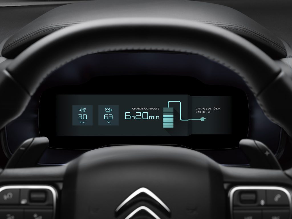 Stikalo na sredinski konzoli je namenjeno izbiri režima vožnje na bencinski, kombiniran in električni pogon. Napolnjena baterija z zmogljivostjo 13,2 kilovatnih ur zadošča za do 50 kilometrov vožnje s hitrostjo do 135 kilometrov na uro brez hrupa in izpustov, a dejanski doseg je verjetno nekoliko manjši. Serijsko je vgrajen 3,7 kilovatni notranji polnilnikom, za doplačilo pa ponujajo 7,4-kilovatnega, preko katerega se baterija na hišni električni omarici napolni v dveh urah. Na običaji gospodinjski vtičnici polnjenje traja več kot sedem ur in je najbolj primerno v nočnem času. Čez čas bo polnjenje in načrtovanje porabe elektrike mogoče tudi s pomočjo telefonske aplikacije.