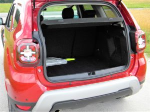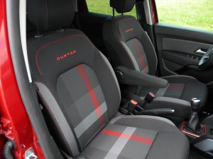 Voznik se mora navaditi tudi na bolj poševno vetrobransko steklo, zaradi katerega se v sprednjem delu poraja občutek utesnjenosti. Kljub temu, da Duster ni med največjimi v svojem razredu (med novopečenimi športnimi terenci izstopa predvsem z višino in oddaljenostjo od tal) je potniška kabina razmeroma prostorna in tudi sedenje na zadnji klopi je udobno, vsaj dokler na sprednjih sedežih nista nadpovprečno visoka potnika. Prtljažnik s 445 litri osnovne prostornine je v tem razredu kar dober dosežek, vendar je prtljago treba dvigniti precej visoko.