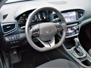 Šetstopenjski samodejni dvosklopčni menjalnik vselej brez obotavljanja poslušno opravlja svoje delo, v varčnem programu optimizira prestavljanje tako, da motor porabi čim manj bencina, v športnem dlje časa zadržuje nižje prestave in po potrebi bencinskemu priskoči na pomoč tudi električni motor. Priključno hibridni Ioniq ima posebej oblikovana 16-palčna aluminijasta platišča, zračne zavese na prednjih kolesih in seveda aerodinamično oblikovano karoserijo z zadnjim difuzorjem in zračnim stabilizatorjem na prtljažnih vratih; vse to se izkaže v nizkem količniku zračnega upora, ki znaša 0,24. Poleg prostorne notranjosti Ioniq premore tudi soliden 550-litrski prtljažnik, ki ga je mogoče z zlaganjem naslonjal zadnjih sedežev povečati za dodatnih 200 litrov.