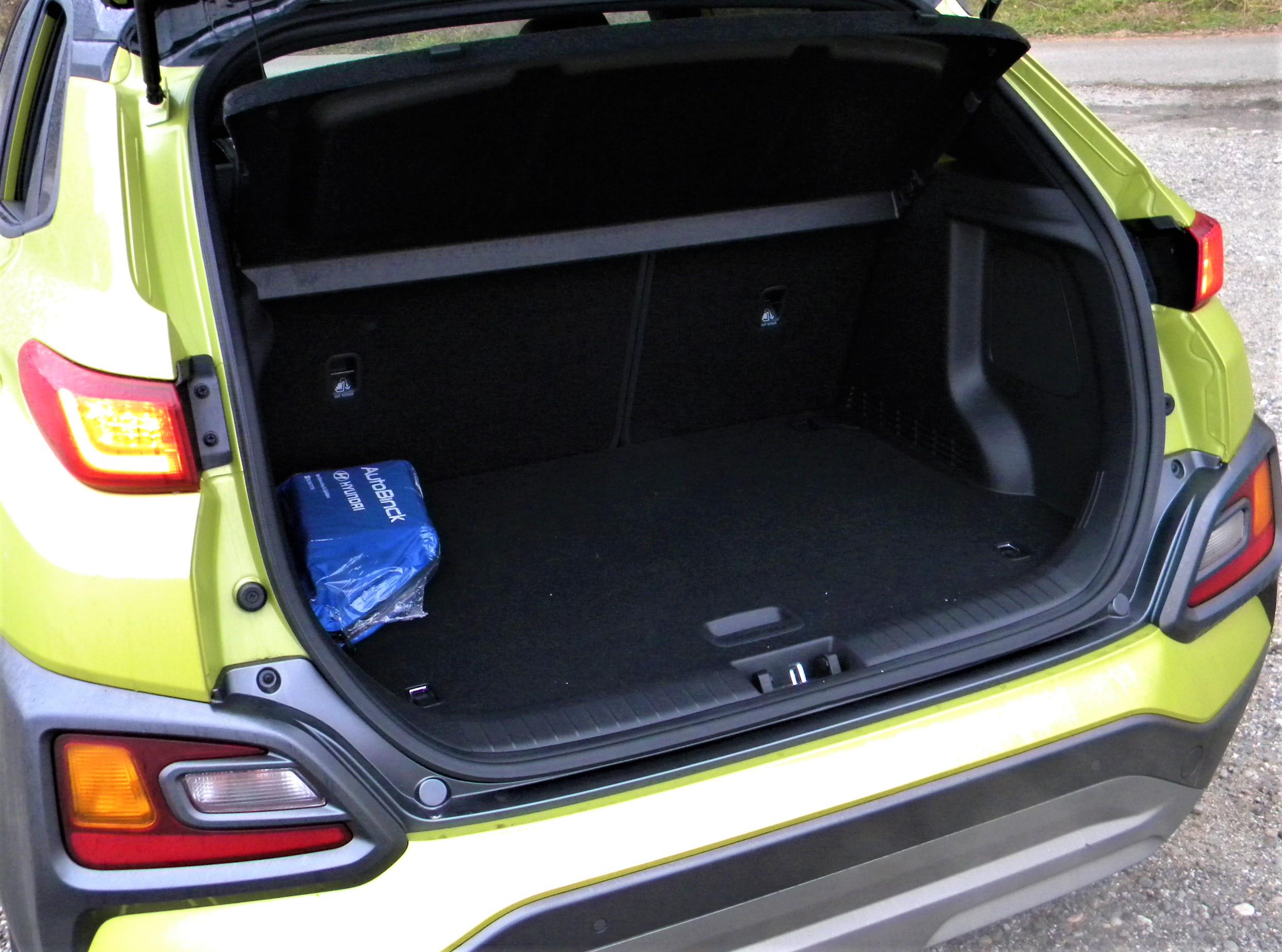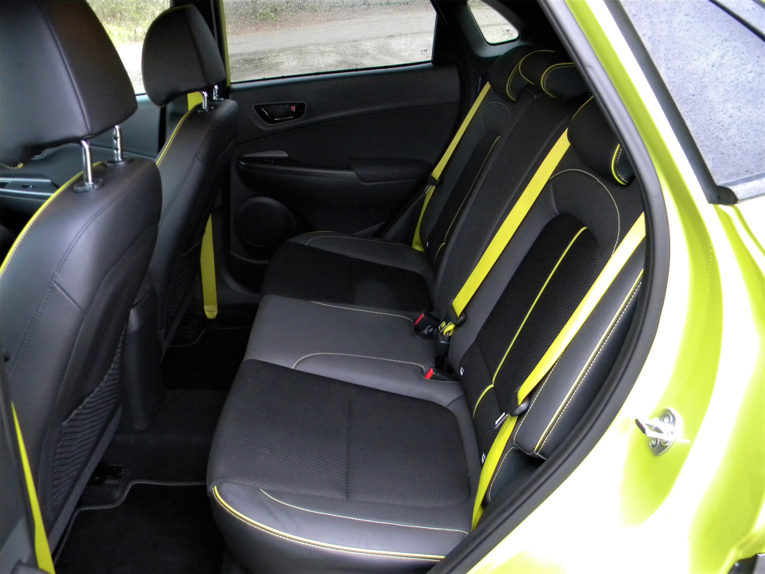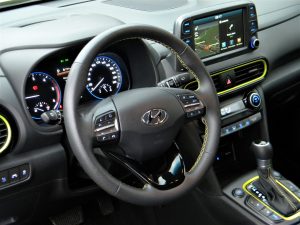 Kona je nekaj centimetrov daljša od sestrične Kie Stonic, toda kar nekaj neposrednih tekmecev ima v notranjosti več prostora. Ko na sprednji desni sedež sede sam sebe polni srednješolski najstnik in za njim na zadnji sedež devetošolec, kaj hitro pride do prepira. Vzdolžnega prostora hitro zmanjka, zato je Kona bolj avtomobil za dva ali za tričlansko družino z majhnim otrokom kot pa prvo družinsko prevozno sredstvo. Tudi osnovna prostornina prtljažnika je namreč razmeroma skromna in pri prevozu večjih kosov prtljage je skoraj neizogibno zlaganje zadnje klopi. Sprednja sedeža sta dobro nastavljiva in solidno oprimeta telesi voznika in sovoznika, volanski obroč ima zadosten pomik v globino in višino in merilniki so veliki in dobro pregledni. Navidezna preprosto armaturne plošče skupaj z velikim sredinskim informacijskim zaslonom zna ugajati, kar pa ne velja za trdo plastiko, iz katere so tudi obloge vrat. Barvni dodatki cenenost sicer nekoliko ublažijo, hkrati pa poskrbijo za prijetnejše bivalne občutke.