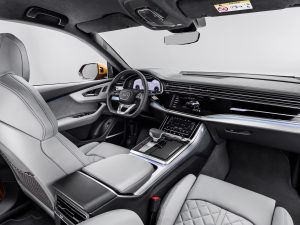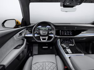 Ker je terensko dvignjen, se v Q8 sedi razmeroma visoko, a zaradi kupejevske silhuete, ki narekuje tudi stekla v vratih brez okvirjev, nič slabše kot če bi bila zunanjost bolj oglata. Voznikov delovni prostor zelo spominja na tisto, kar je modelih A7 in A8, kar pomeni, da je armaturna plošča v dobršni meri digitalizirana, vozniku pa pri upravljanju pomagajo številni asistenti za varnejšo in udobnejšo vožnjo. Med drugim tudi nadzorni sistem, ki spremlja okolico avtomobila in v primeru trčenja primerno reagira in zavaruje potnike. Potem so med visokotehnološkimi pridobitvami tudi matrični žarometi s svetečimi diodami, ki samodejno usmerjajo svetlobni snop in na ta način poskrbijo za odlično osvetlitev ceste v vseh razmerah. Vrsta dodatkov seveda ni vključenih v serijsko opremo, ampak je zanje treba doplačati.