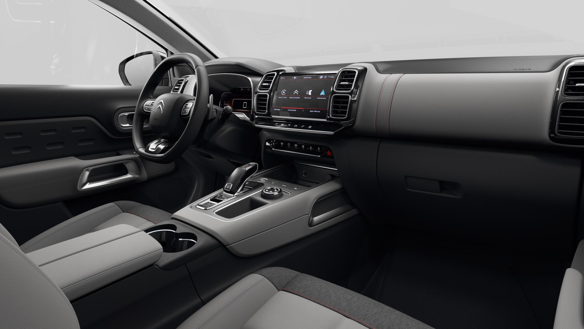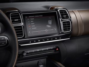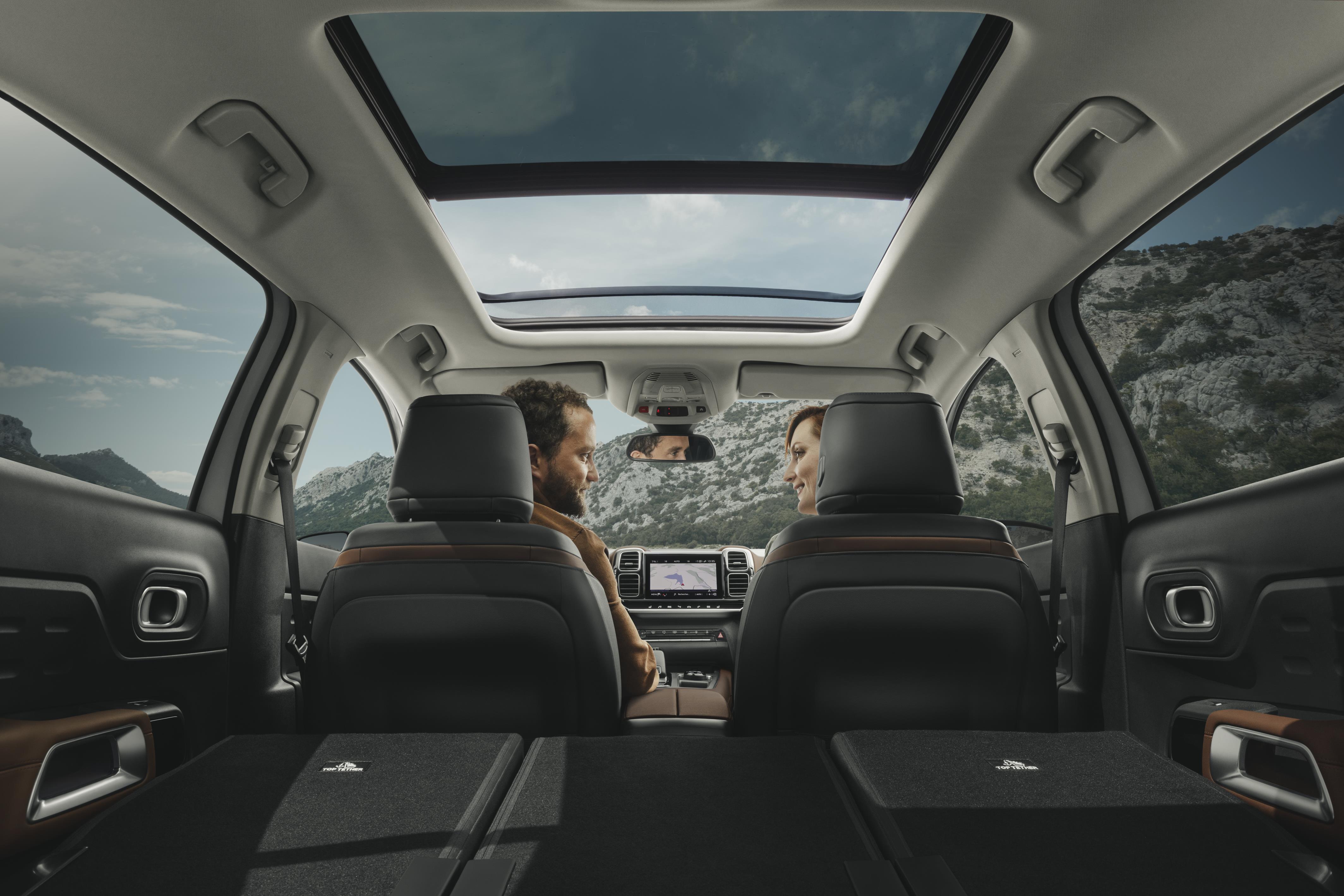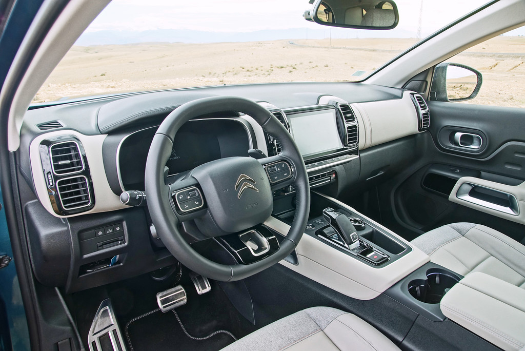 V notranjosti so oblikovalci v dobršni meri sprostili svojo domišljijo, armaturna plošča je v pretežni meri digitalizirana, saj voznik lahko razbira podatke in se igra z nastavitvami s pomočjo dveh različno velikih zaslonov, pri čemer je sredinski občutljiv na dotik. Tudi zato v tem avtomobilu skoraj ni več običajnih stikal. Glede udobja C5 Aircross ne sklepa veliko kompromisov, kar med drugim dokazujejo trije ločeno vzdolžno nastavljivi sedeži, ki so sicer obloženi s posebno peno. V prtljažniku je 580 litrov osnovnega prostora, odpiranju prtljažnih vrat pa lahko streže tudi elektrika, ki se sproži prostoročno.