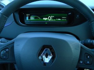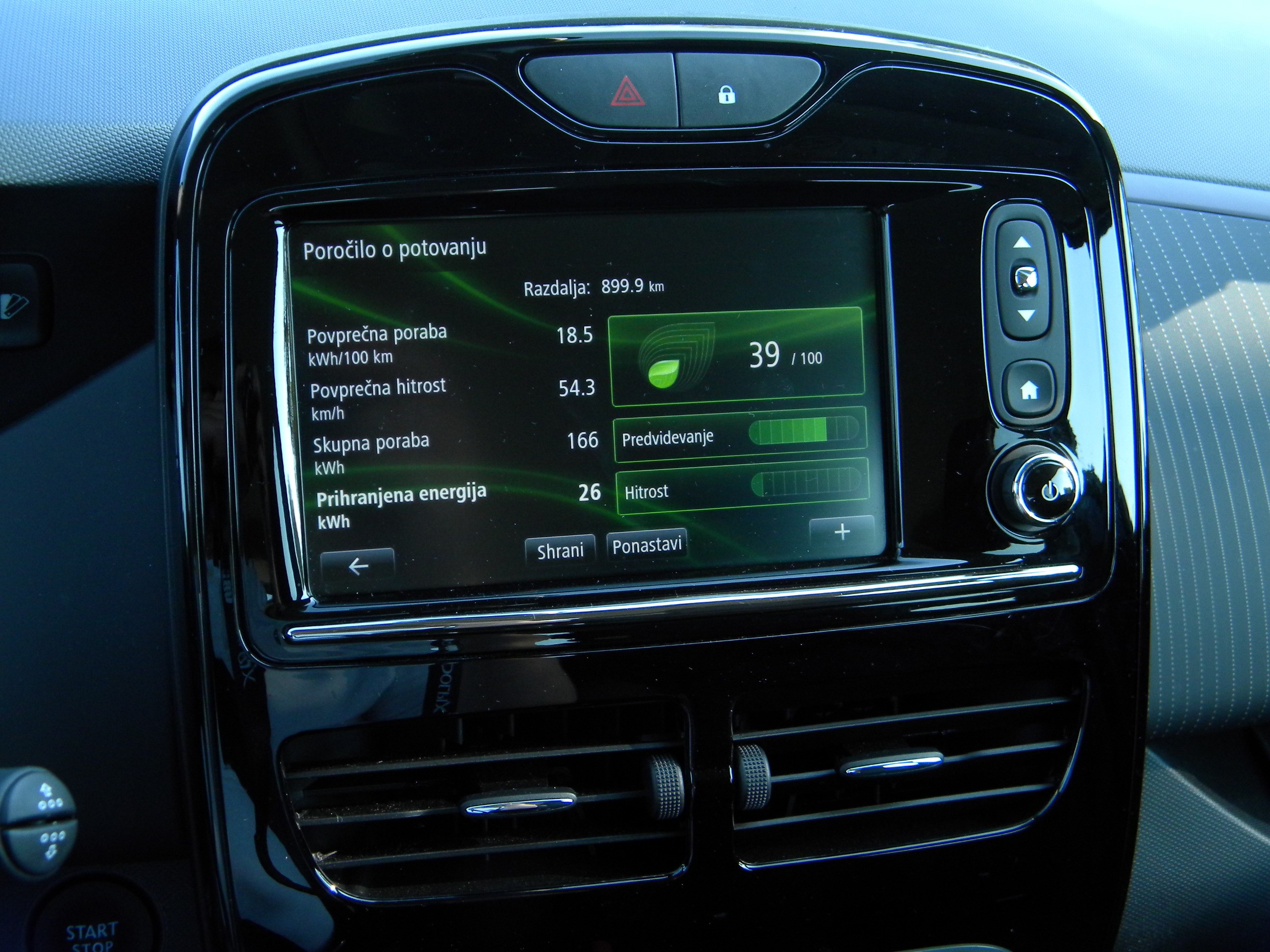 Tudi armaturna plošča z digitalnim prikazovalnikom pred voznikovimi očmi, je del celotne sodobne zasnove. Voznik se lahko poigra z barvnimi in grafičnimi shemami, hkrati se spreminja tudi zvok delovanja smernih kazalcev. Poleg migotajočih številk za hitrost in prikaza polnosti baterije ter grafike za porabo, sta na voljo tudi podatka o trenutni in povprečni porabi, ki je na preizkusu znašala dobrih 20 kilovatnih ur. Ob tem podatku je treba upoštevati tudi, da je bil avtomobil na cesti ob nizkih temperaturah in večino voženj opravljenih v ekonomičnem programu. Osrednji zaslon na dotik je zelo podoben kot v drugih Renaultovih modelih, seveda komunikacijski sistem omogoča priključitev zunanjih podatkovnih nosilcev, povezavo z mobilnim telefonom, za doplačilo pa tudi navigacijo. Posebno poglavje (ki ga je priporočljivo prebrati v knjigi z navodili za uporabo) je ogrevanje in hlajenje; avtomobil se namreč z zalogo toplote oskrbi med polnjenjem baterije, želeni čas ogrevanja pa je treba nastaviti.